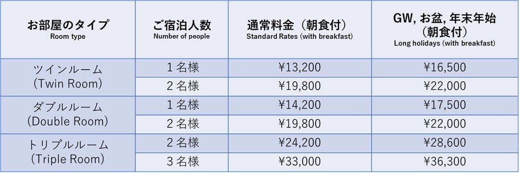 Rates may differ from the regular rates above depending on the date and number of people. Please contact us for your rates.